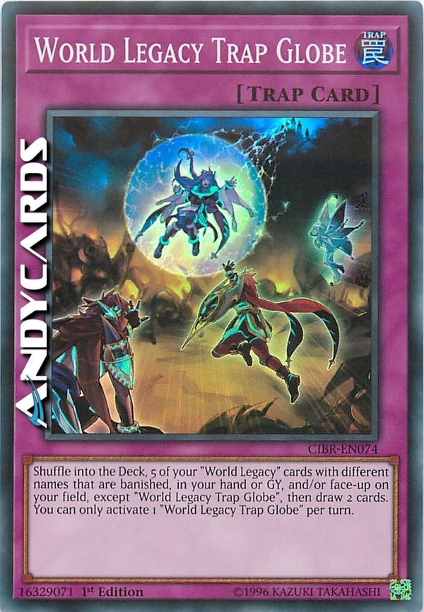 Shuffle into the Deck, 5 of your "World Legacy" cards with different names that are banished, in your hand or GY, and/or face-up on your field, except "World Legacy Trap Globe", then draw 2 cards. You can only activate 1 "World Legacy Trap Globe" per turn.