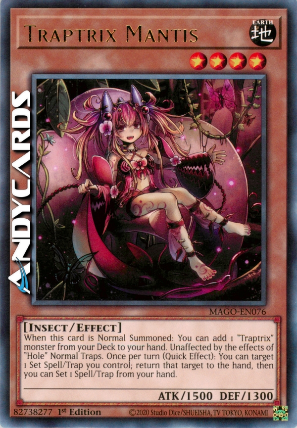 Unaffected by the effects of "Hole" Normal Traps. When this card is Normal Summoned: You can add 1 "Traptrix" monster from your Deck to your hand. Once per turn (Quick Effect): You can target 1 Set Spell/Trap you control; return that target to the hand, then you can Set 1 Spell/Trap from your hand.