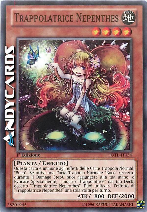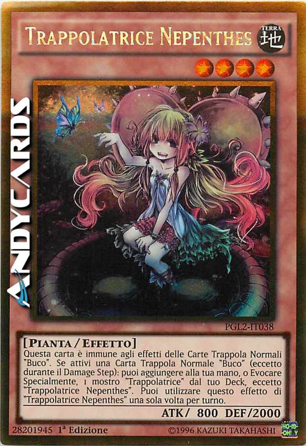 Questa carta è immune agli effetti delle Carte Trappola Normali "Buco". Se attivi una Carta Trappola Normale "Buco" (eccetto durante il Damage Step): puoi aggiungere alla tua mano, o Evocare Specialmente, 1 mostro "Trappolatrice" dal tuo Deck, eccetto "Trappolatrice Nepenthes". Puoi utilizzare l'effetto di "Trappolatrice Nephentes" una sola volta per turno.