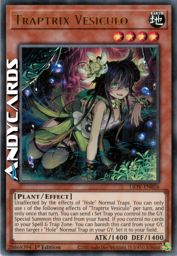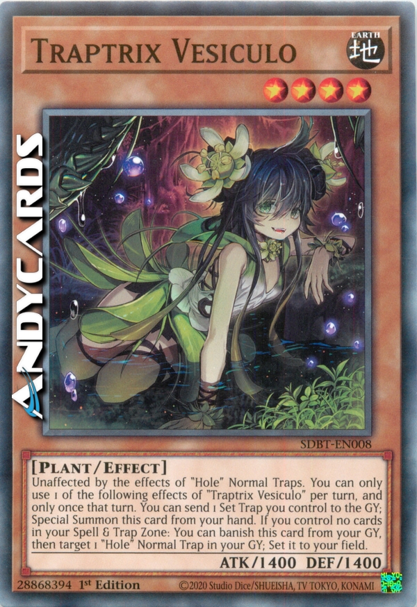 Unaffected by the effects of "Hole" Normal Traps. You can only use 1 of the following effects of "Traptrix Vesiculo" per turn, and only once that turn. You can send 1 Set Trap you control to the GY; Special Summon this card from your hand. If you control no cards in your Spell & Trap Zone: You can banish this card from your GY, then target 1 "Hole" Normal Trap in your GY; Set it to your field.