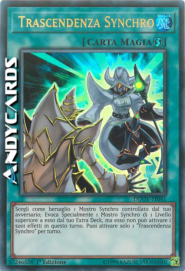 Scegli come bersaglio 1 Mostro Synchro controllato dal tuo avversario; Evoca Specialmente 1 Mostro Synchro di 1 Livello superiore a esso dal tuo Extra Deck, ma esso non può attivare i suoi effetti in questo turno. Puoi attivare solo 1 "Trascendenza Synchro" per turno.