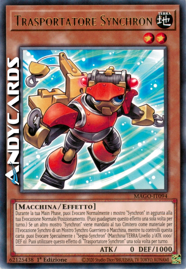Durante la tua Main Phase, puoi Evocare Normalmente 1 mostro "Synchron" in aggiunta alla tua Evocazione Normale/Posizionamento. (Puoi guadagnare questo effetto una sola volta per turno.) Se un altro mostro "Synchron" viene mandato al tuo Cimitero come Materiale Synchro per l'Evocazione Synchro di un Mostro Synchro di Tipo Guerriero o Macchina, mentre tu controlli questa carta: puoi Evocare Specialmente 1 "Segna-Synchron" (Tipo Macchina/TERRA/Livello 2/ATK 1000/DEF 0). Puoi utilizzare questo effetto di "Trasportatore Synchron" una sola volta per turno.