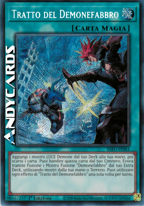 Aggiungi 1 mostro LUCE Demone dal tuo Deck alla tua mano, poi scarta 1 carta. Puoi bandire questa carta dal tuo Cimitero; Evoca tramite Fusione 1 Mostro Fusione "Demonefabbro" dal tuo Extra Deck, utilizzando mostri dalla tua mano o Terreno. Puoi utilizzare ogni effetto di "Tratto del Demonefabbro" una sola volta per turno.