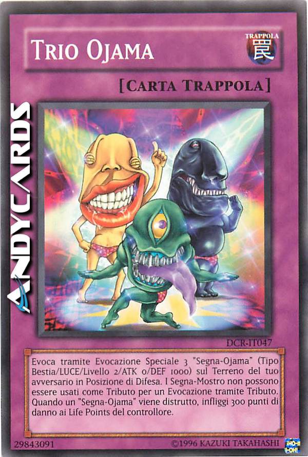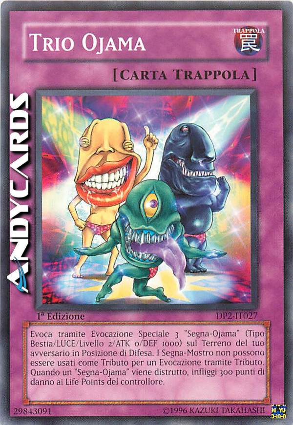 Evoca Specialmente 3 "Segna-Ojama" (Tipo Bestia/LUCE/Livello 2/ATK 0/DEF 1000) sul Terreno del tuo avversario in Posizione di Difesa. Essi non possono essere offerti come Tributo per un'Evocazione tramite Tributo e, ogni volta che 1 viene distrutto, il suo controllore subisce 300 danni.