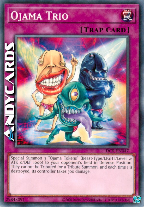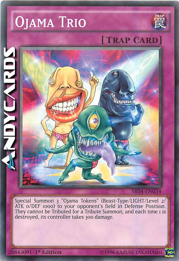 Special Summon 3 "Ojama Tokens" (Beast-Type/LIGHT/Level 2/ATK 0/DEF 1000) to your opponent's field in Defense Position. They cannot be Tributed for a Tribute Summon, and each time 1 is destroyed, its controller takes 300 damage.