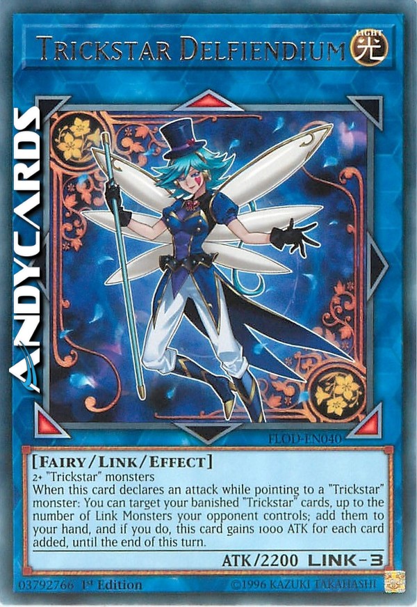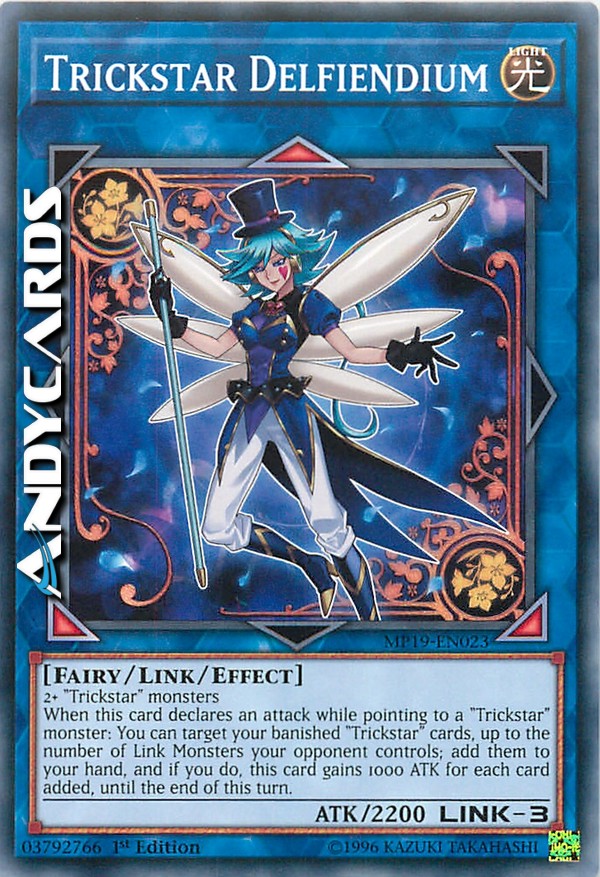 When this card declares an attack while pointing to a "Trickstar" monster: You can target your banished "Trickstar" cards, up to the number of Link Monsters your opponent controls; add them to your hand, and if you do, this card gains 1000 ATK for each card added, until the end of this turn.