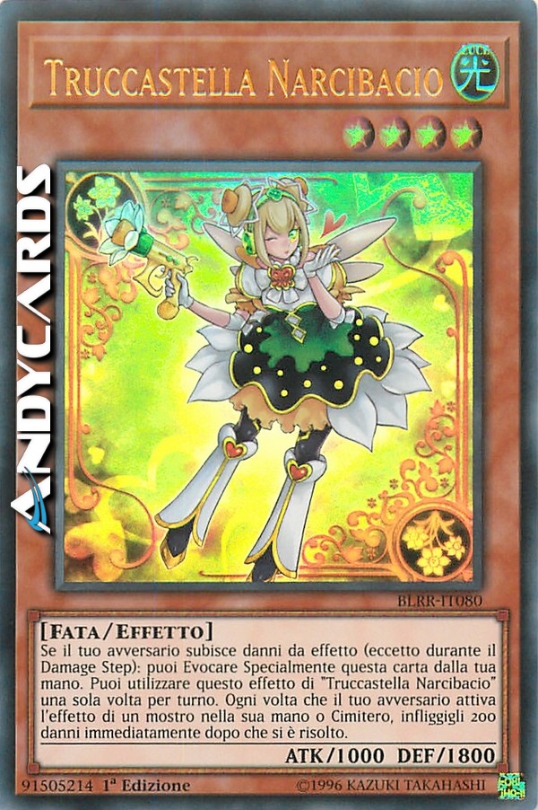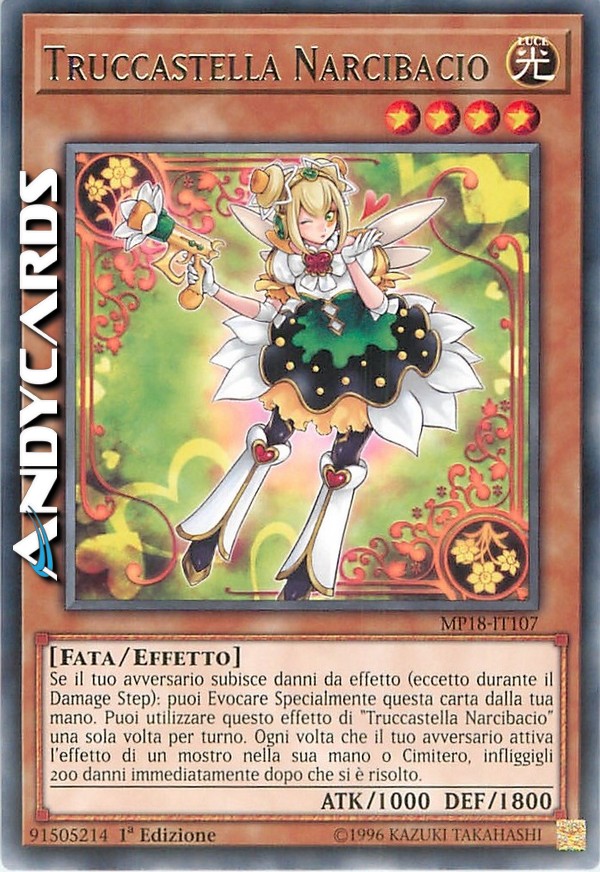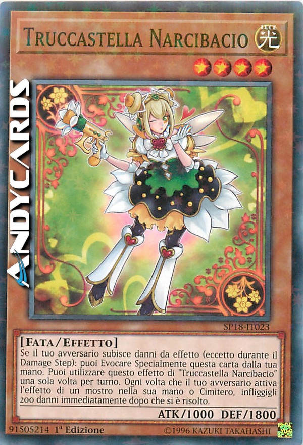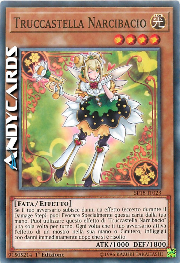 Se il tuo avversario subisce danni da effetto (eccetto durante il Damage Step): puoi Evocare Specialmente questa carta dalla tua mano. Puoi utilizzare questo effetto di "Truccastella Narcibacio" una sola volta per turno. Ogni volta che il tuo avversario attiva l'effetto di un mostro nella sua mano o Cimitero, infliggigli 200 danni immediatamente dopo che si è risolto.