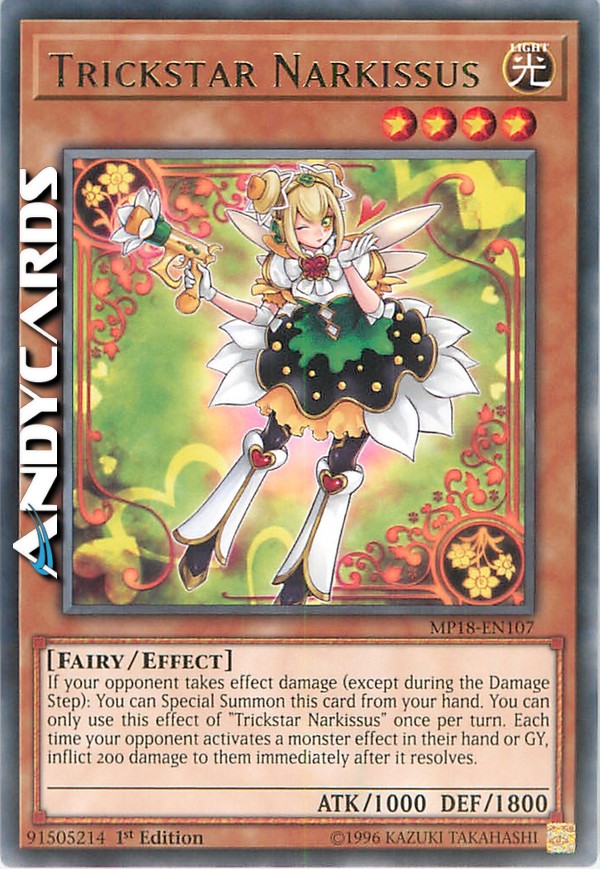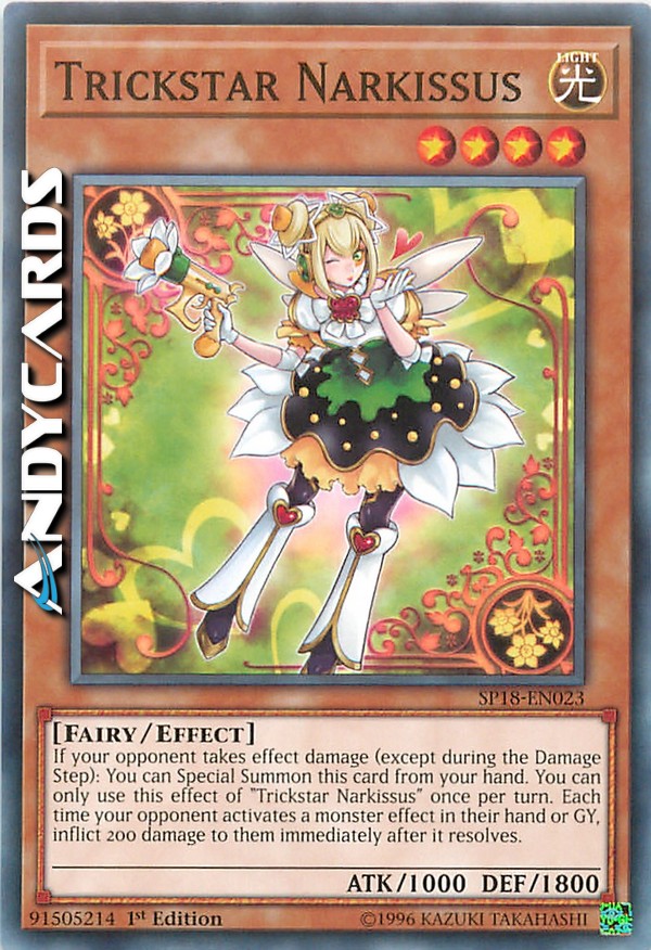 If your opponent takes effect damage (except during the Damage Step): You can Special Summon this card from your hand. You can only use this effect of "Trickstar Narkissus" once per turn. Each time your opponent activates a monster effect in their hand or GY, inflict 200 damage to them immediately after it resolves.