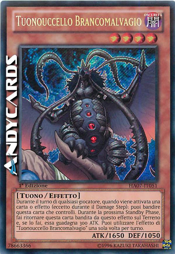 Durante il turno di qualsiasi giocatore, quando viene attivata una carta o effetto (eccetto durante il Damage Step): puoi bandire questa carta che controlli. Durante la prossima Standby Phase, fai ritornare questa carta bandita da questo effetto sul Terreno e, se lo fai, essa guadagna 300 ATK. Puoi utilizzare l'effetto di "Tuonouccello Brancomalvagio" una sola volta per turno.