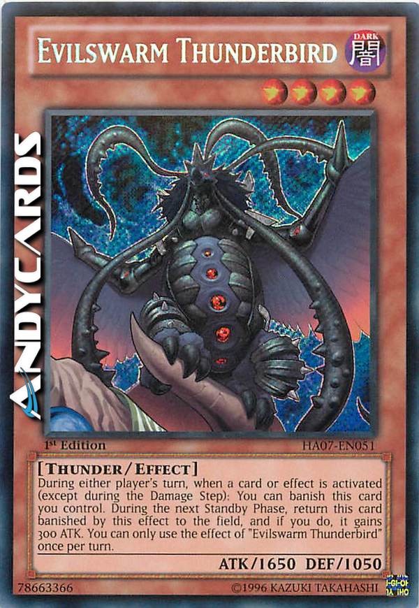 During either player's turn, when a card or effect is activated (except during the Damage Step): You can banish this card you control. During your next Standby Phase, return this card banished by this effect to the field, and if you do, it gains 300 ATK. You can only use the effect of "Evilswarm Thunderbird" once per turn.