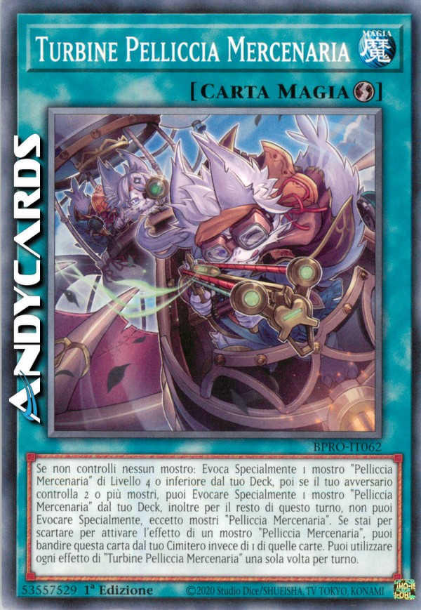 Se non controlli nessun mostro: Evoca Specialmente 1 mostro "Pelliccia Mercenaria" di Livello 4 o inferiore dal tuo Deck, poi se il tuo avversario controlla 2 o più mostri, puoi Evocare Specialmente 1 mostro "Pelliccia Mercenaria" dal tuo Deck, inoltre per il resto di questo turno, non puoi Evocare Specialmente, eccetto mostri "Pelliccia Mercenaria". Se stai per scartare per attivare l'effetto di un mostro "Pelliccia Mercenaria", puoi bandire questa carta dal tuo Cimitero invece di 1 di quelle carte. Puoi utilizzare ogni effetto di "Turbine Pelliccia Mercenaria" una sola volta per turno.