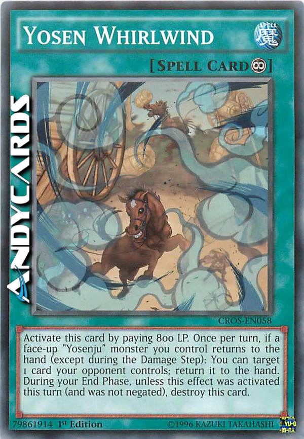 Attiva questa carta pagando 800 LP. Una volta per turno, se un mostro "Yosenju" scoperto che controlli ritorna nella mano (eccetto durante il Damage Step): puoi scegliere come bersaglio 1 carta controllata dal tuo avversario; falla ritornare nella mano. Durante la tua End Phase, a meno che questo effetto sia stato attivato in questo turno (e non sia stato annullato), distruggi questa carta.