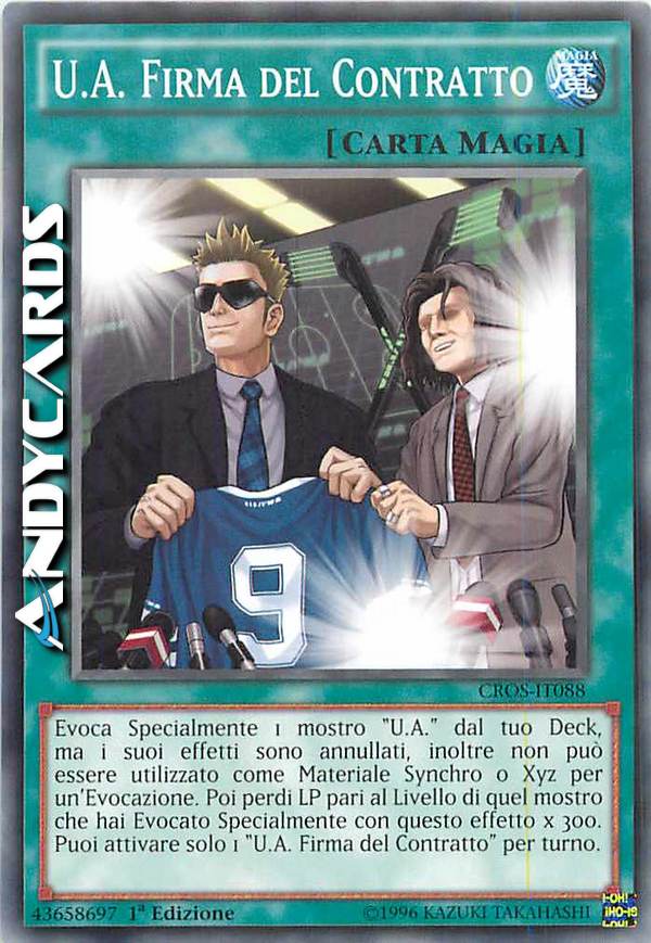 Evoca Specialmente 1 mostro "U.A." dal tuo Deck, ma i suoi effetti sono annullati, inoltre esso non può essere utilizzato come Materiale Synchro o Xyz per un'Evocazione. Poi perdi LP pari al Livello di quel mostro x 300. Puoi attivare solo 1 "U.A. Firma del Contratto" per turno.