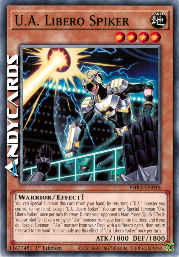 You can Special Summon this card (from your hand) by returning 1 "U.A." monster you control to the hand, except "U.A. Libero Spiker". You can only Special Summon "U.A. Libero Spiker" once per turn this way. During your opponent's Main Phase (Quick Effect): You can shuffle 1 Level 5 or higher "U.A." monster from your hand into the Deck, and if you do, Special Summon 1 "U.A." monster from your Deck with a different name, then return this card to the hand. You can only use this effect of "U.A. Libero Spiker" once per turn.
