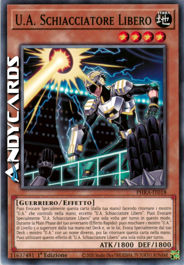 Puoi Evocare Specialmente questa carta (dalla tua mano) facendo ritornare 1 mostro "U.A." che controlli nella mano, eccetto "U.A. Schiacciatore Libero". Puoi Evocare Specialmente "U.A. Schiacciatore Libero" una sola volta per turno in questo modo. Durante la Main Phase del tuo avversario (Effetto Rapido): puoi mischiare 1 mostro "U.A." di Livello 5 o superiore dalla tua mano nel Deck e, se lo fai, Evoca Specialmente dal tuo Deck 1 mostro "U.A." con un nome diverso, poi fai ritornare questa carta nella mano. Puoi utilizzare questo effetto di "U.A. Schiacciatore Libero" una sola volta per turno.
