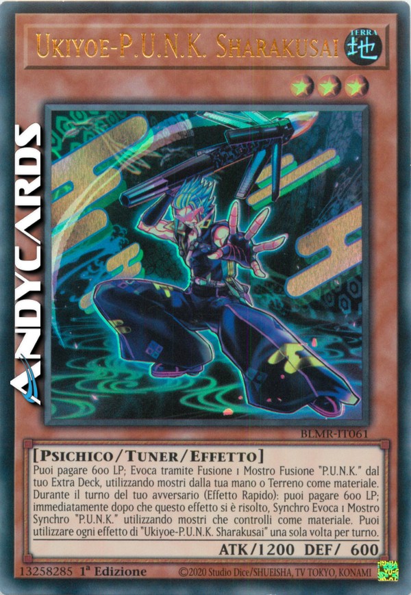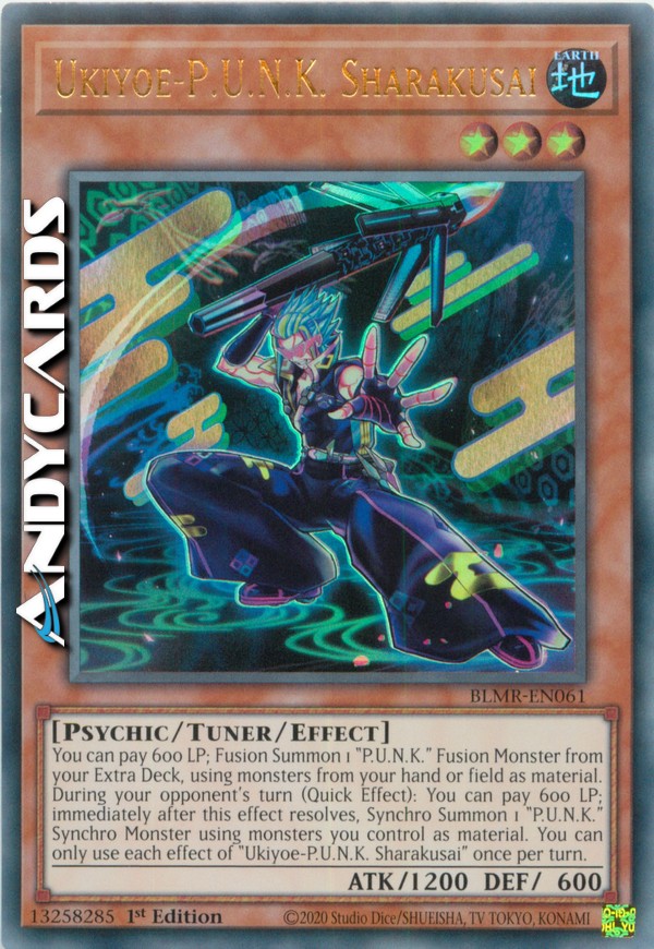 Puoi pagare 600 LP; Evoca tramite Fusione 1 Mostro Fusione "P.U.N.K." dal tuo Extra Deck, utilizzando mostri dalla tua mano o Terreno come materiale. Durante il turno del tuo avversario (Effetto Rapido): puoi pagare 600 LP; immediatamente dopo che questo effetto si è risolto, Synchro Evoca 1 Mostro Synchro "P.U.N.K." utilizzando mostri che controlli come materiale. Puoi utilizzare ogni effetto di "Ukiyoe-P.U.N.K. Sharakusai" una sola volta per turno.