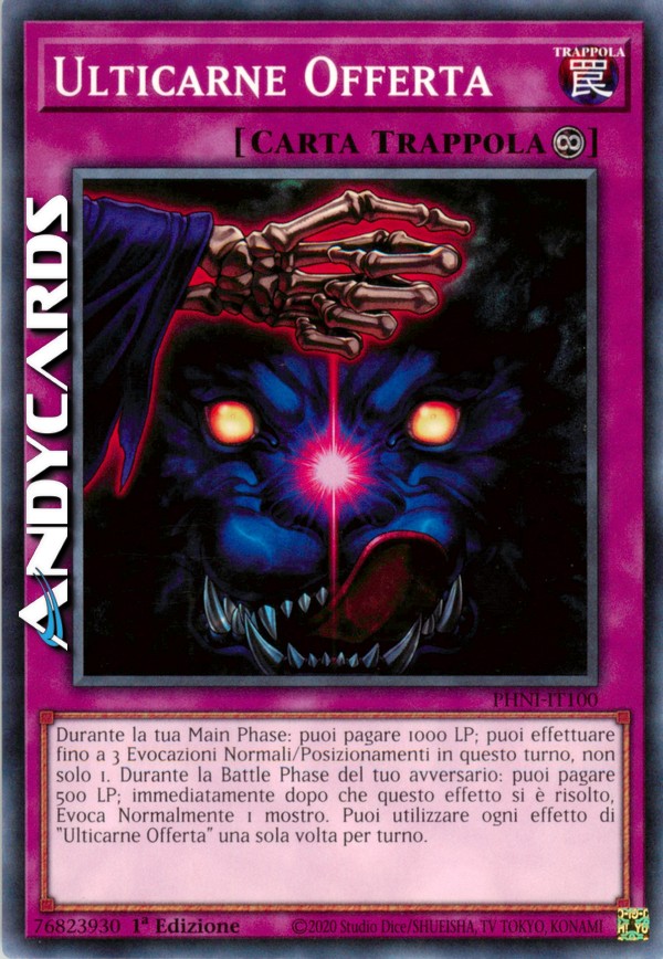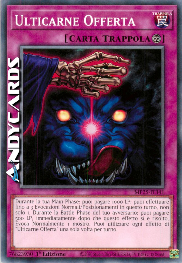 Durante la tua Main Phase: puoi pagare 1000 LP; puoi effettuare fino a 3 Evocazioni Normali/Posizionamenti in questo turno, non solo 1. Durante la Battle Phase del tuo avversario: puoi pagare 500 LP; immediatamente dopo che questo effetto si è risolto, Evoca Normalmente 1 mostro. Puoi utilizzare ogni effetto di "Ulticarne Offerta" una sola volta per turno.