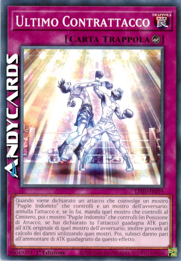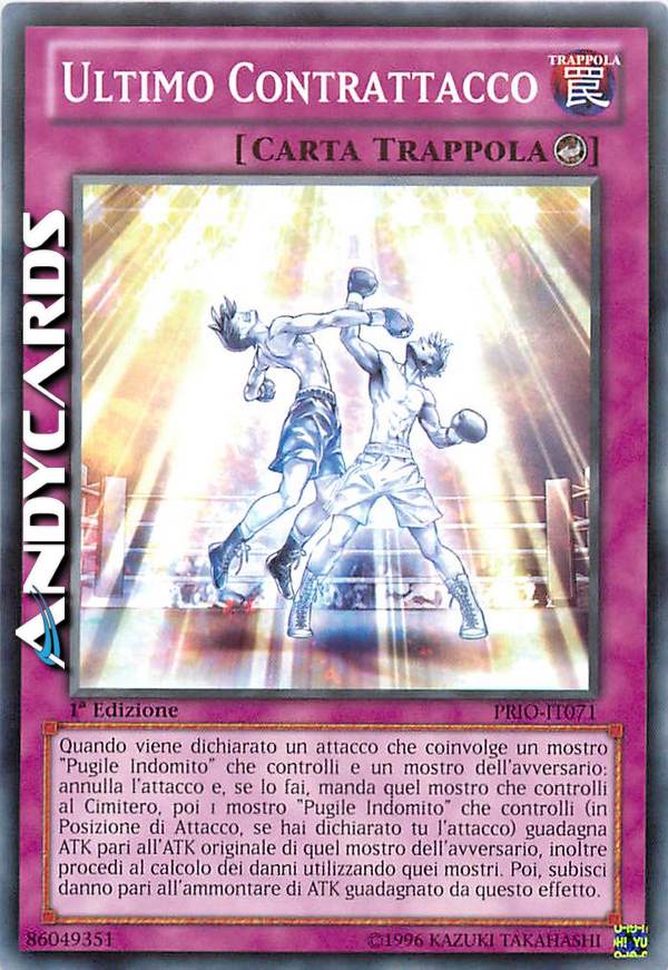 Quando viene dichiarato un attacco che coinvolge un mostro "Pugile Indomito" che controlli e un mostro dell'avversario: annulla l'attacco e, se lo fai, manda quel mostro che controlli al Cimitero, poi 1 mostro "Pugile Indomito" che controlli (in Posizione di Attacco, se hai dichiarato tu l'attacco) guadagna ATK pari all'ATK originale di quel mostro dell'avversario, inoltre procedi al calcolo dei danni utilizzando quei mostri. Poi, subisci danno pari all'ammontare di ATK guadagnato da questo effetto.