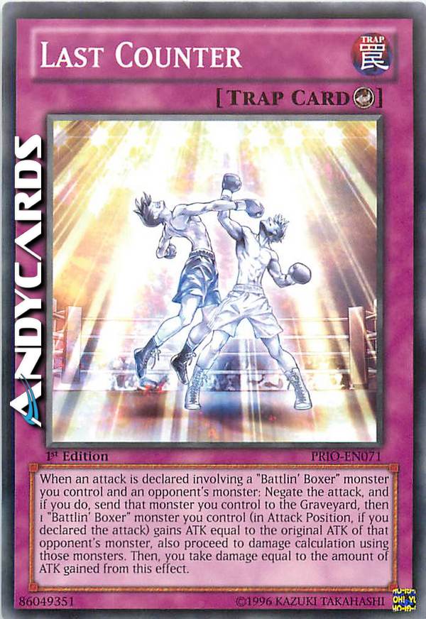 When an attack is declared involving a "Battlin' Boxer" monster you control and an opponent's monster: Negate the attack, and if you do, send that monster you control to the GY, then 1 "Battlin' Boxer" monster you control (in Attack Position, if you declared the attack) gains ATK equal to the original ATK of that opponent's monster, also proceed to damage calculation using those monsters. Then, you take damage equal to the amount of ATK gained from this effect.