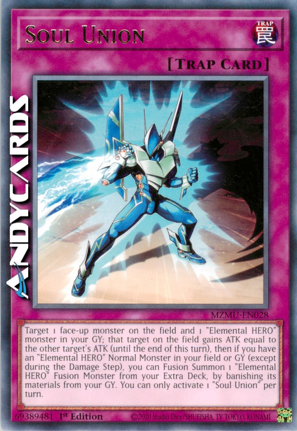 Target 1 face-up monster on the field and 1 "Elemental HERO" monster in your GY; that target on the field gains ATK equal to the other target's ATK (until the end of this turn), then if you have an "Elemental HERO" Normal Monster in your field or GY (except during the Damage Step), you can Fusion Summon 1 "Elemental HERO" Fusion Monster from your Extra Deck, by banishing its materials from your GY. You can only activate 1 "Soul Union" per turn.