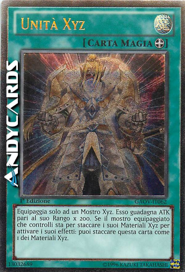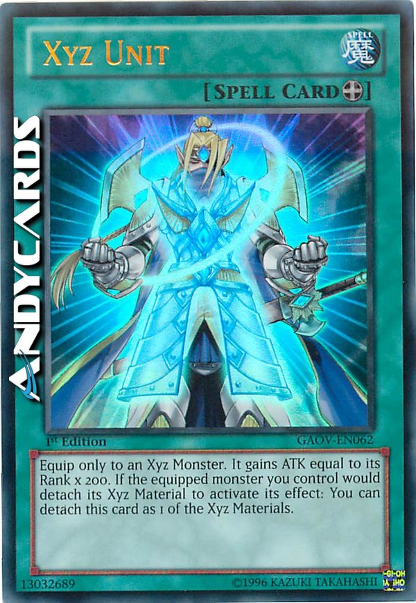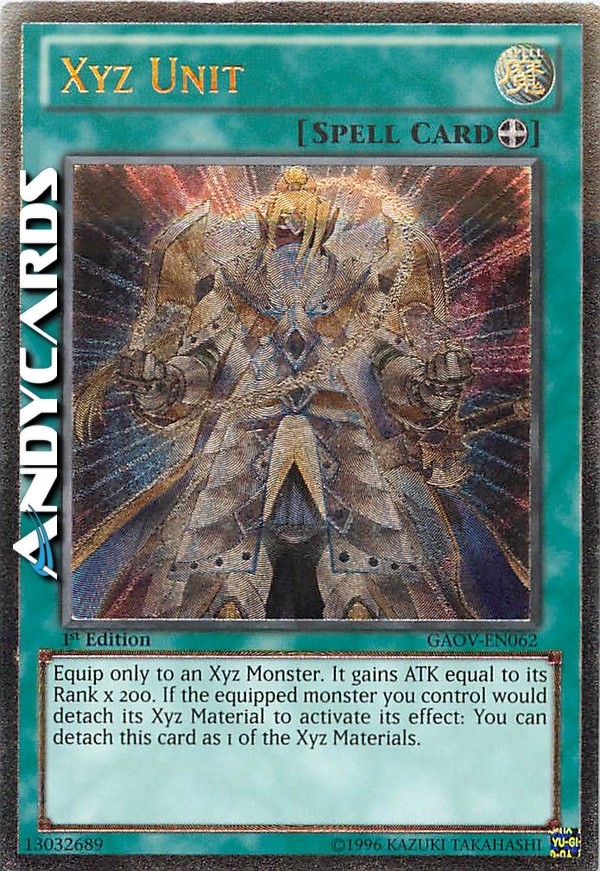Equipaggia solo ad un Mostro Xyz scoperto. Esso guadagna ATK pari al suo Rango x 200. Se il mostro equipaggiato che controlli sta per staccare il suo materiale per attivare i suoi effetti: puoi staccare questa carta come 1 dei materiali.
