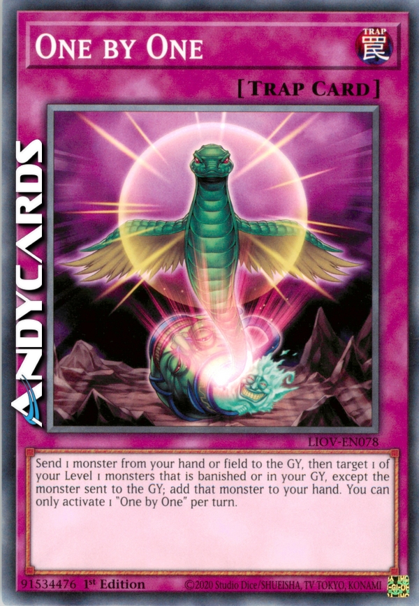 Send 1 monster from your hand or field to the GY, then target 1 of your Level 1 monsters that is banished or in your GY, except the monster sent to the GY; add that monster to your hand. You can only activate 1 "One by One" per turn.