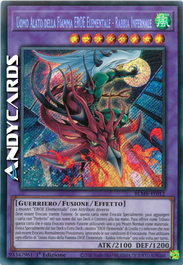 Deve essere Evocato tramite Fusione. Se questa carta viene Evocata Specialmente: puoi aggiungere 1 carta con "Preferito" nel suo nome dal tuo Deck o Cimitero alla tua mano. Puoi offrire come Tributo questa carta che è stata Evocata tramite Fusione utilizzando uno o più Mostri Normali come materiale; Evoca Specialmente dal tuo Deck o Extra Deck 1 mostro "EROE Elementale" di Livello 7 o inferiore che non può essere Evocato Normalmente/Posizionato, ignorando le sue condizioni di Evocazione. Puoi utilizzare ogni effetto di "Uomo Alato della Fiamma EROE Elementale - Rabbia Infernale" una sola volta per turno.