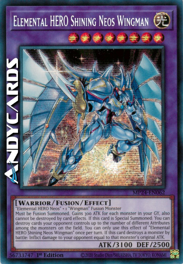 Must be Fusion Summoned. Gains 300 ATK for each monster in your GY, also cannot be destroyed by card effects. If this card is Special Summoned: You can destroy cards your opponent controls up to the number of different Attributes among the monsters on the field. You can only use this effect of "Elemental HERO Shining Neos Wingman" once per turn. If this card destroys a monster by battle: Inflict damage to your opponent equal to that monster's original ATK.
