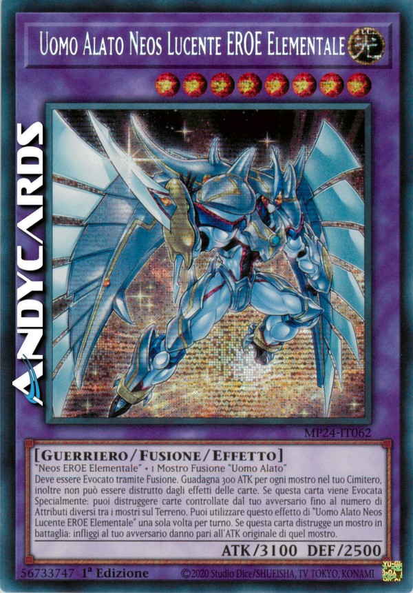 Deve essere Evocato tramite Fusione. Guadagna 300 ATK per ogni mostro nel tuo Cimitero, inoltre non può essere distrutto dagli effetti delle carte. Se questa carta viene Evocata Specialmente: puoi distruggere carte controllate dal tuo avversario fino al numero di Attributi diversi tra i mostri sul Terreno. Puoi utilizzare questo effetto di "Uomo Alato Neos Lucente EROE Elementale" una sola volta per turno. Se questa carta distrugge un mostro in battaglia: infliggi al tuo avversario danno pari all'ATK originale di quel mostro.