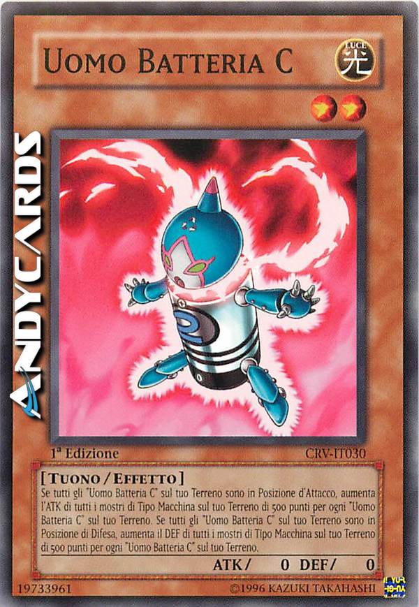 Se tutti gli "Uomo Batteria C" sul tuo Terreno sono in Posizione di Attacco, aumenta l'ATK di tutti i mostri di Tipo Macchina sul tuo Terreno di 500 punti per ogni "Uomo Batteria C" sul tuo terreno. Se tutti gli "Uomo Batteria C" sul tuo Terreno sono in Posizione di Difesa, aumenta il DEF di tutti i mostri di Tipo Macchina sul tuo Terreno di 500 punti per ogni "Uomo Batteria C" sul tuo terreno.