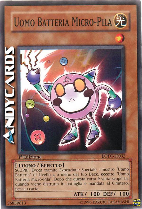 SCOPRI: Evoca tramite Evocazione Speciale 1 mostro "Uomo Batteria" di Livello 4 o meno dal tuo Deck, eccetto "Uomo Batteria Micro-Pila". Dopo che questa carta è stata scoperta, quando viene distrutta in battaglia e mandata al Cimitero, pesca 1 carta.