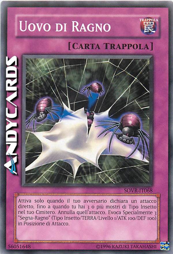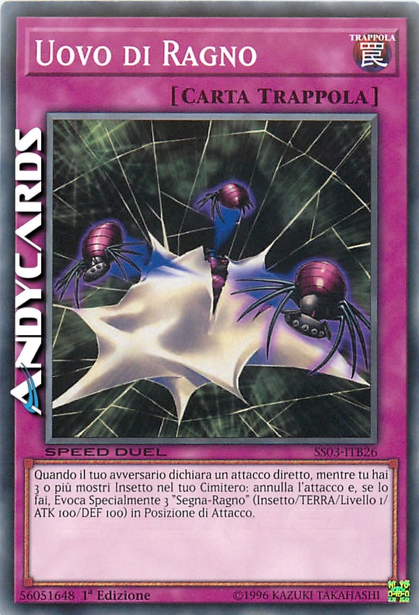 Attiva solo quando il tuo avversario dichiara un attacco diretto, fino a quando tu hai 3 o più mostri di Tipo Insietto nel tuo Cimitero. Annulla quell'attacco. Evoca Specialmente 3 "Segna-Ragno" (Tipo Insetto/TERRA/Livello 1/ATK 100/DEF 100) in Posizione di Attacco.