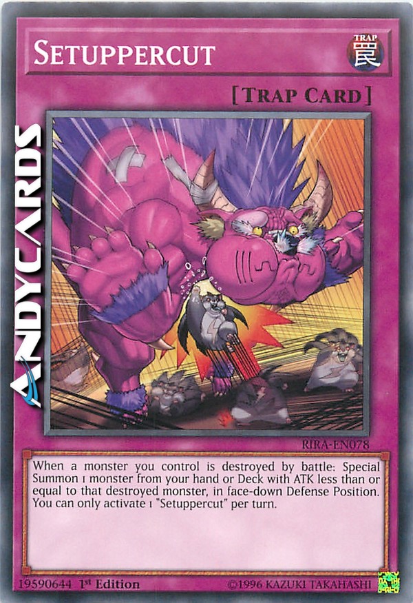 When a monster you control is destroyed by battle: Special Summon 1 monster from your hand or Deck with ATK less than or equal to that destroyed monster, in face-down Defense Position. You can only activate 1 "Setuppercut" per turn.