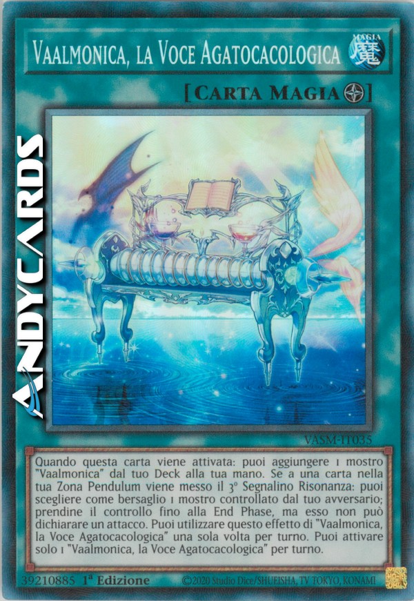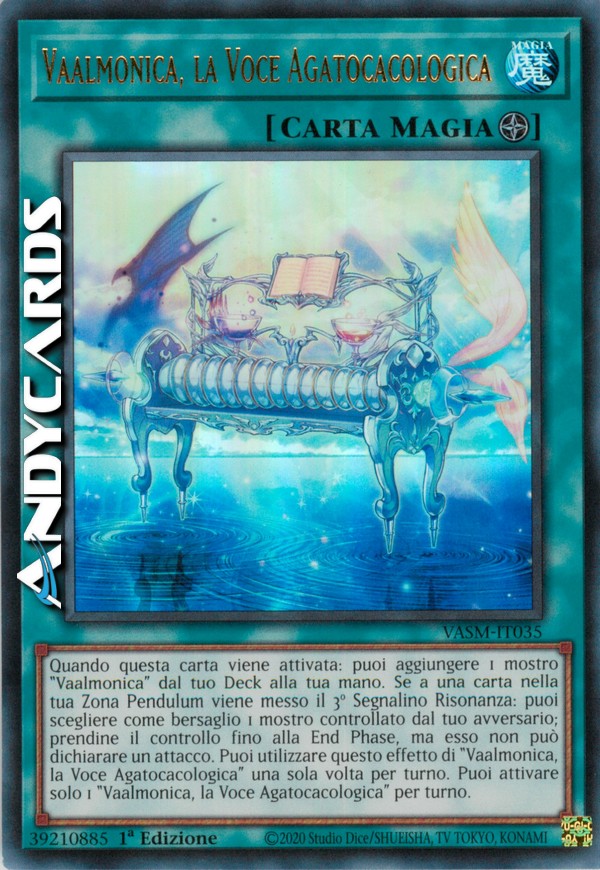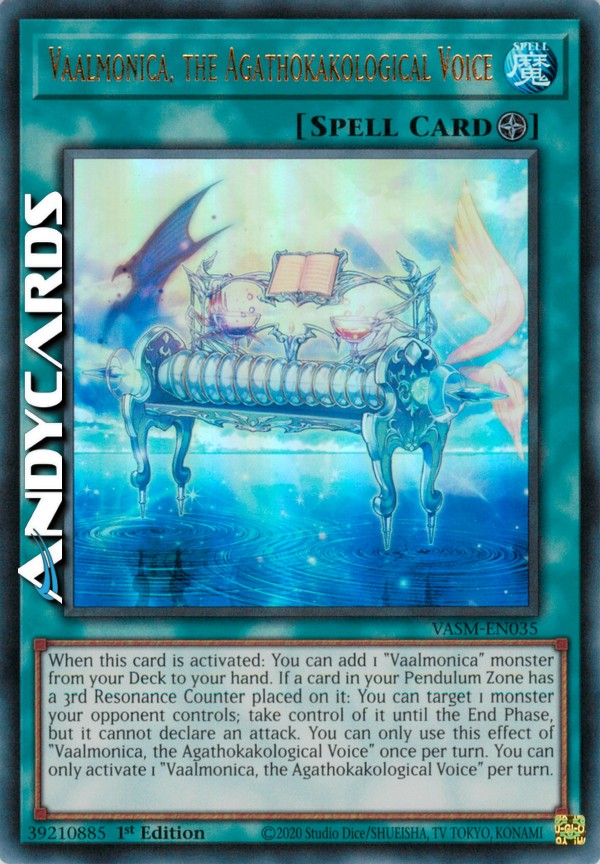 Quando questa carta viene attivata: puoi aggiungere 1 mostro "Vaalmonica" dal tuo Deck alla tua mano. Se a una carta nella tua Zona Pendulum viene messo il 3º Segnalino Risonanza: puoi scegliere come bersaglio 1 mostro controllato dal tuo avversario; prendine il controllo fino alla End Phase, ma esso non può dichiarare un attacco. Puoi utilizzare questo effetto di "Vaalmonica, la Voce Agatocacologica" una sola volta per turno. Puoi attivare solo 1 "Vaalmonica, la Voce Agatocacologica" per turno.