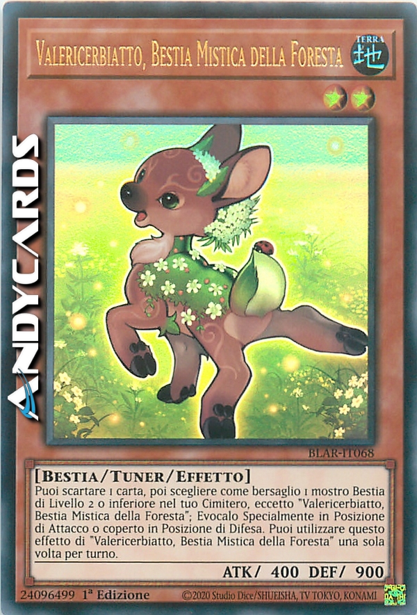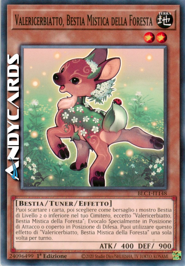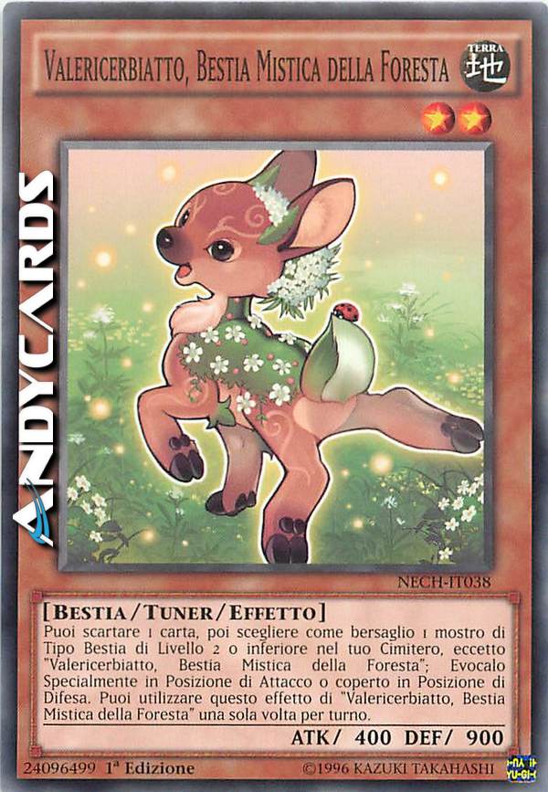 Puoi scartare 1 carta, poi scegliere come bersaglio 1 mostro Bestia di Livello 2 o inferiore nel tuo Cimitero, eccetto "Valericerbiatto, Bestia Mistica della Foresta"; Evocalo Specialmente in Posizione di Attacco o coperto in Posizione di Difesa. Puoi utilizzare questo effetto di "Valericerbiatto, Bestia Mistica della Foresta" una sola volta per turno.