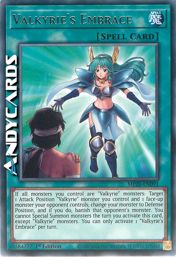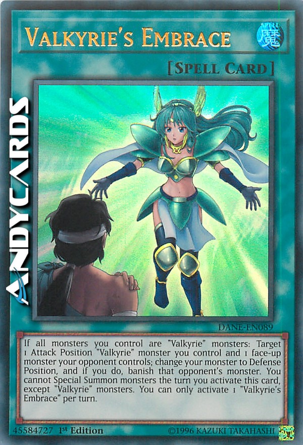 Se tutti i mostri che controlli sono mostri "Valkyria-": scegli come bersaglio 1 mostro "Valkyria-" in Posizione di Attacco che controlli e 1 mostro scoperto controllato dal tuo avversario; metti il tuo mostro in Posizione di Difesa e, se lo fai, bandisci quel mostro dell'avversario. Non puoi Evocare Specialmente mostri nel turno in cui attivi questa carta, eccetto mostri "Valkyria-". Puoi attivare solo 1 "Valkyria-Abbraccio" per turno.