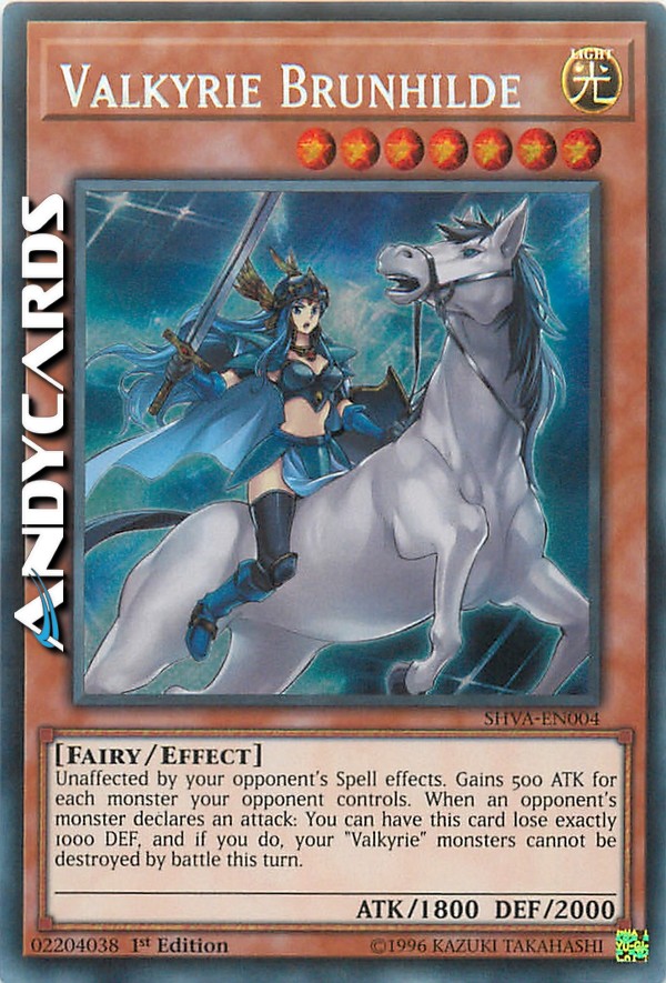Unaffected by your opponent's Spell effects. Gains 500 ATK for each monster your opponent controls. When an opponent's monster declares an attack: You can have this card lose exactly 1000 DEF, and if you do, your "Valkyrie" monsters cannot be destroyed by battle this turn.