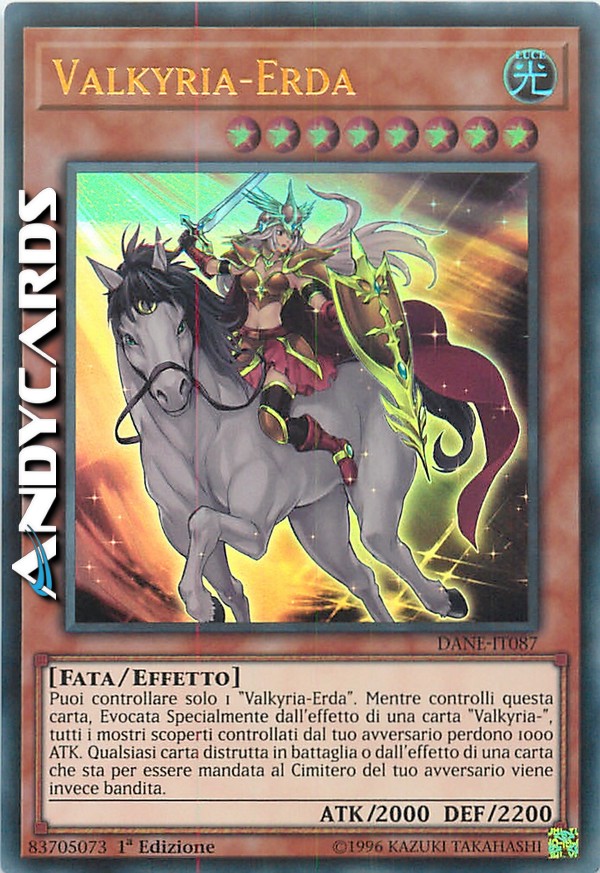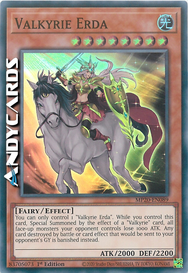 Puoi controllare solo 1 "Valkyria-Erda". Mentre controlli questa carta, Evocata Specialmente dall'effetto di una carta "Valkyria-", tutti i mostri scoperti controllati dal tuo avversario perdono 1000 ATK. Qualsiasi carta distrutta in battaglia o dall'effetto di una carta che sta per essere mandata al Cimitero del tuo avversario viene invece bandita.