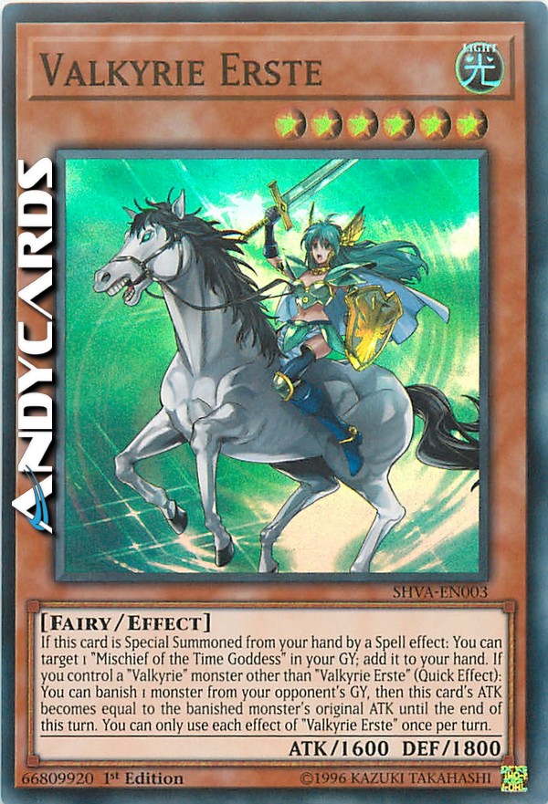 If this card is Special Summoned from your hand by a Spell effect: You can target 1 "Mischief of the Time Goddess" in your GY; add it to your hand. If you control a "Valkyrie" monster other than "Valkyrie Erste" (Quick Effect): You can banish 1 monster from your opponent's GY, then this card's ATK becomes equal to the banished monster's original ATK until the end of this turn. You can only use each effect of "Valkyrie Erste" once per turn.