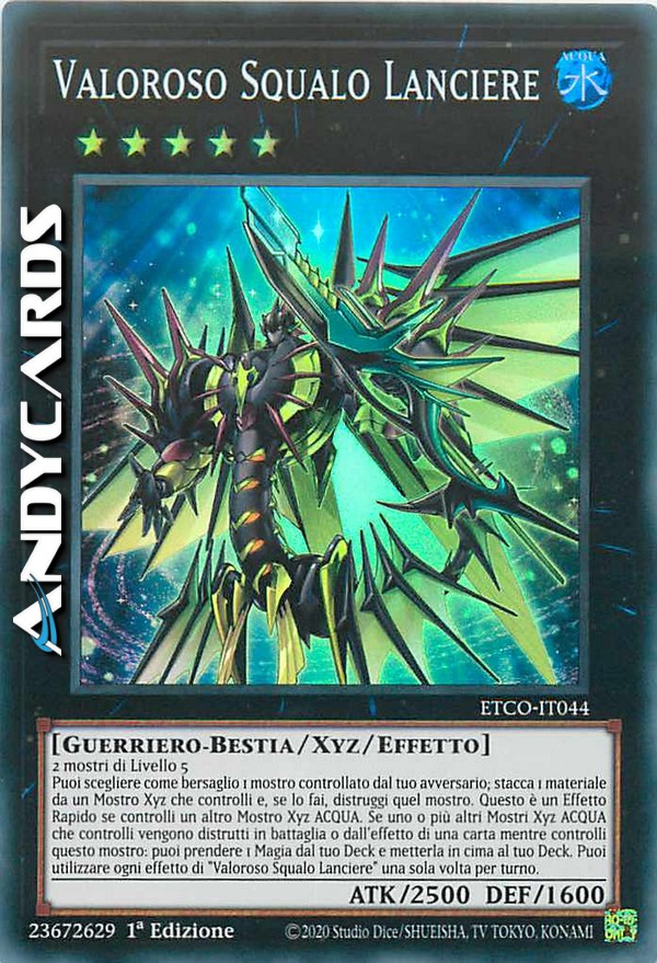 Puoi scegliere come bersaglio 1 mostro controllato dal tuo avversario; stacca 1 materiale da un Mostro Xyz che controlli e, se lo fai, distruggi quel mostro. Questo è un Effetto Rapido se controlli un altro Mostro Xyz ACQUA. Se uno o più altri Mostri Xyz ACQUA che controlli vengono distrutti in battaglia o dall'effetto di una carta mentre controlli questo mostro: puoi mettere 1 Magia dal tuo Deck in cima al tuo Deck. Puoi utilizzare ogni effetto di "Valoroso Squalo Lanciere" una sola volta per turno.