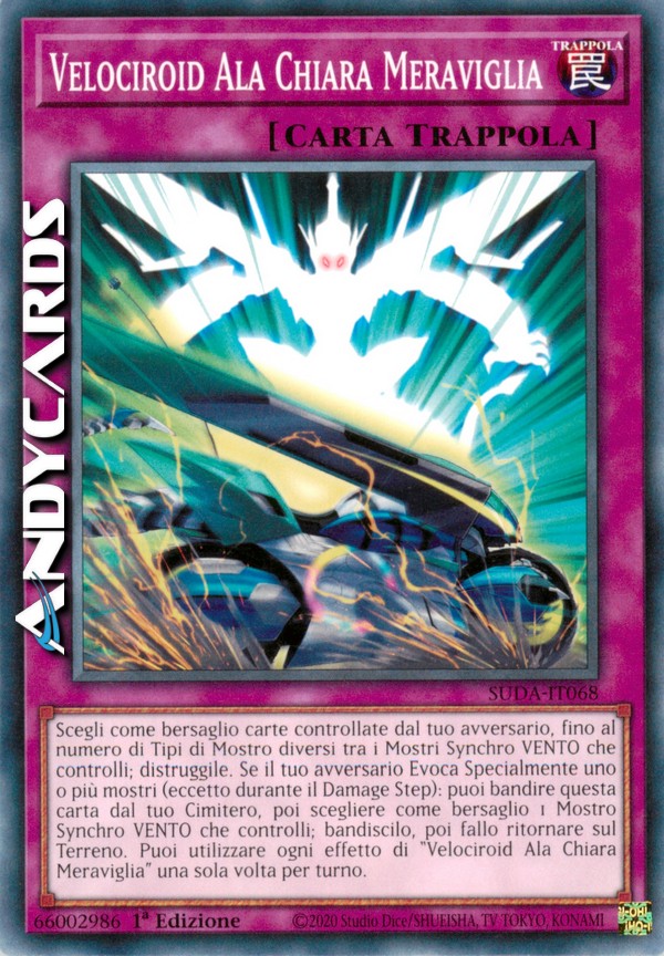 Scegli come bersaglio carte controllate dal tuo avversario, fino al numero di Tipi di Mostro diversi tra i Mostri Synchro VENTO che controlli; distruggile. Se il tuo avversario Evoca Specialmente uno o più mostri (eccetto durante il Damage Step): puoi bandire questa carta dal tuo Cimitero, poi scegliere come bersaglio 1 Mostro Synchro VENTO che controlli; bandiscilo, poi fallo ritornare sul Terreno. Puoi utilizzare ogni effetto di "Velociroid Ala Chiara Meraviglia" una sola volta per turno.