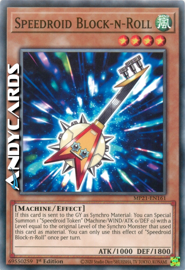 If this card is sent to the GY as Synchro Material: You can Special Summon 1 "Speedroid Token" (Machine/WIND/ATK 0/DEF 0) with a Level equal to the original Level of the Synchro Monster that used this card as material. You can only use this effect of "Speedroid Block-n-Roll" once per turn.
