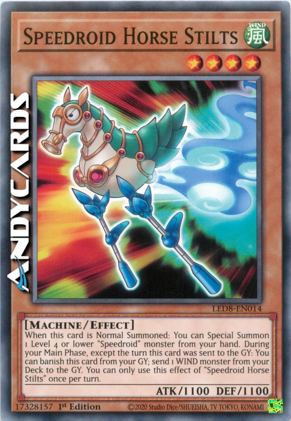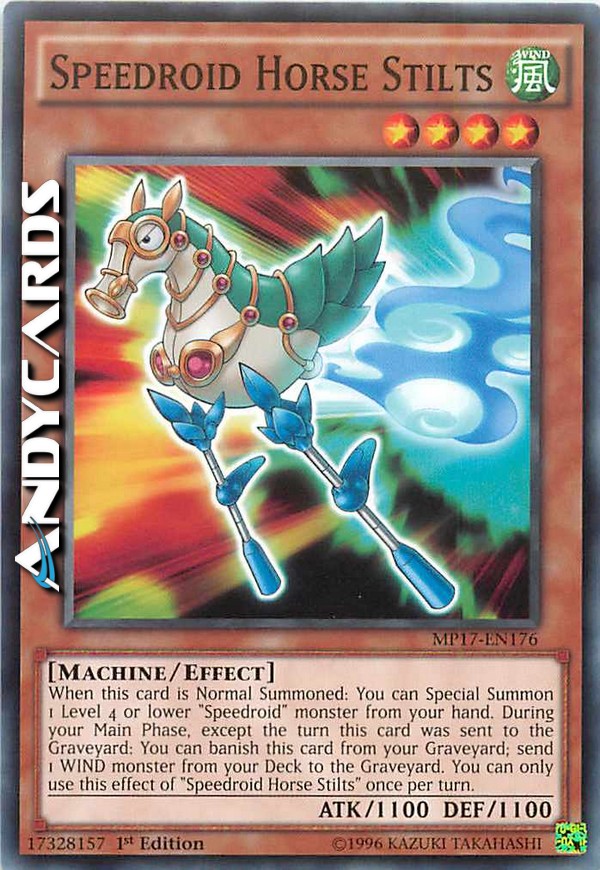 When this card is Normal Summoned: You can Special Summon 1 Level 4 or lower "Speedroid" monster from your hand. During your Main Phase, except the turn this card was sent to the Graveyard: You can banish this card from your Graveyard; send 1 WIND monster from your Deck to the Graveyard. You can only use this effect of "Speedroid Horse Stilts" once per turn.