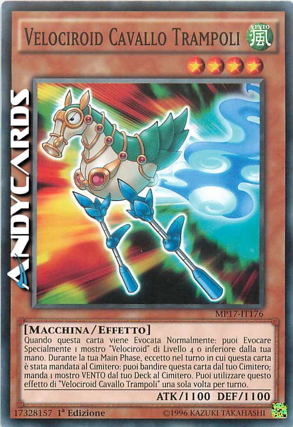 Quando questa carta viene Evocata Normalmente: puoi Evocare Specialmente 1 mostro "Velociroid" di Livello 4 o inferiore dalla tua mano. Durante la tua Main Phase, eccetto nel turno in cui questa carta è stata mandata al Cimitero: puoi bandire questa carta dal tuo Cimitero; manda 1 mostro VENTO dal tuo Deck al Cimitero. Puoi utilizzare questo effetto di "Velociroid Cavallo Trampoli" una sola volta per turno.