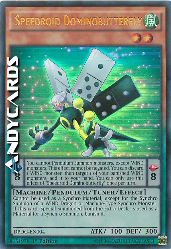 Cannot be used as a Synchro Material, except for the Synchro Summon of a WIND Dragon or Machine-Type Synchro Monster. If this card, Special Summoned from the Extra Deck, is used as a Material for a Synchro Summon, banish it. - Pendulum Effect: You cannot Pendulum Summon monsters, except WIND monsters. This effect cannot be negated. You can discard 1 WIND monster, then target 1 of your banished WIND monsters; add it to your hand. You can only use this effect of "Speedroid Dominobutterfly" once per turn.