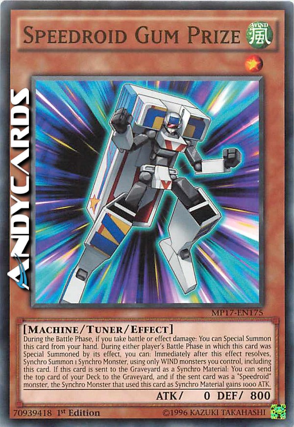 During the Battle Phase, if you take battle or effect damage: You can Special Summon this card from your hand. During either player's Battle Phase in which this card was Special Summoned by its effect, you can: Immediately after this effect resolves, Synchro Summon 1 Synchro Monster, using only WIND monsters you control, including this card. If this card is sent to the Graveyard as a Synchro Material: You can send the top card of your Deck to the Graveyard, and if the sent card was a "Speedroid" monster, the Synchro Monster that used this card as Synchro Material gains 1000 ATK.