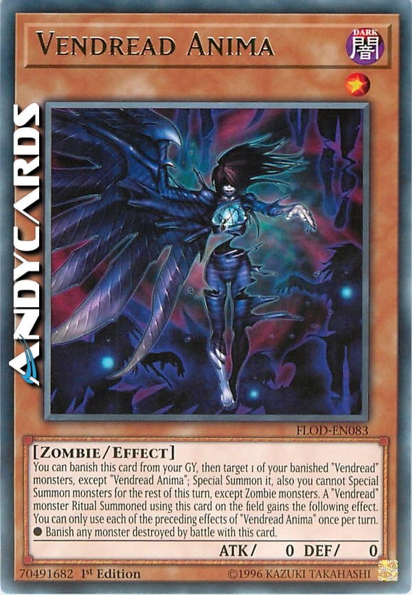 You can banish this card from your GY, then target 1 of your banished "Vendread" monsters, except "Vendread Anima"; Special Summon it, also you cannot Special Summon monsters for the rest of this turn, except Zombie monsters. A "Vendread" monster Ritual Summoned using this card on the field gains the following effect. You can only use each of the preceding effects of "Vendread Anima" once per turn.