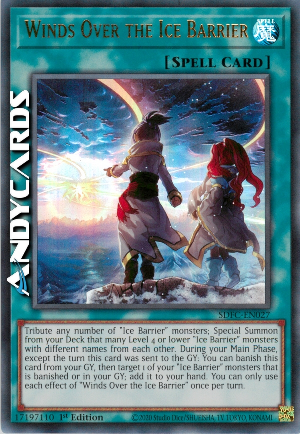 Offri come Tributo un qualsiasi numero di mostri "Barriera di Ghiaccio"; Evoca Specialmente dal tuo Deck quel numero di mostri "Barriera di Ghiaccio" di Livello 4 o inferiore con nomi diversi l'uno dall'altro. Durante la tua Main Phase, eccetto nel turno in cui questa carta è stata mandata al Cimitero: puoi bandire questa carta dal tuo Cimitero, poi scegliere come bersaglio 1 dei tuoi mostri "Barriera di Ghiaccio" che sono banditi o nel tuo Cimitero; aggiungilo alla tua mano. Puoi utilizzare ogni effetto di "Venti Sulla Barriera di Ghiaccio" una sola volta per turno.