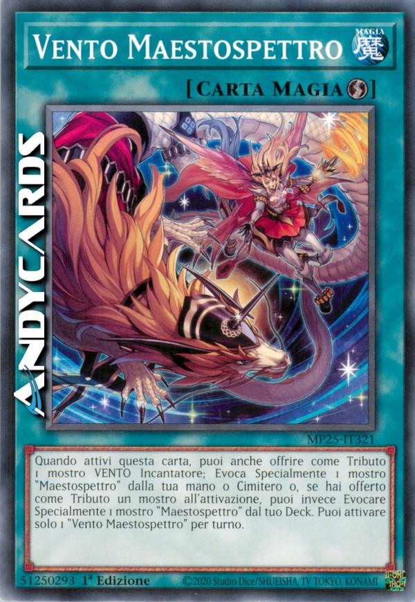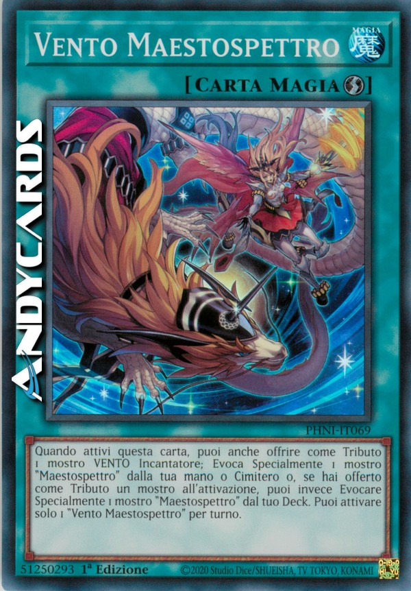 Quando attivi questa carta, puoi anche offrire come Tributo 1 mostro VENTO Incantatore; Evoca Specialmente 1 mostro "Maestospettro" dalla tua mano o Cimitero o, se hai offerto come Tributo un mostro all'attivazione, puoi invece Evocare Specialmente 1 mostro "Maestospettro" dal tuo Deck. Puoi attivare solo 1 "Vento Maestospettro" per turno.
