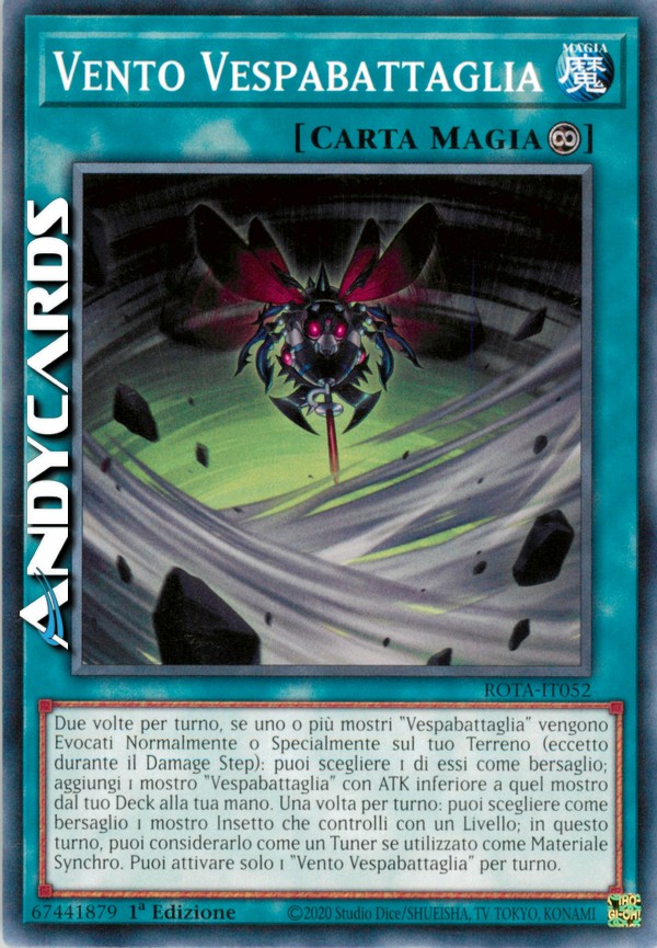 Due volte per turno, se uno o più mostri "Vespabattaglia" vengono Evocati Normalmente o Specialmente sul tuo Terreno (eccetto durante il Damage Step): puoi scegliere 1 di essi come bersaglio; aggiungi 1 mostro "Vespabattaglia" con ATK inferiore a quel mostro dal tuo Deck alla tua mano. Una volta per turno: puoi scegliere come bersaglio 1 mostro Insetto che controlli con un Livello; in questo turno, puoi considerarlo come un Tuner se utilizzato come Materiale Synchro. Puoi attivare solo 1 "Vento Vespabattaglia" per turno.